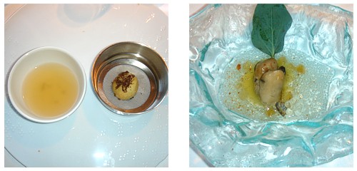 Continuamos nuestro camino con un jugosísimo filete de lenguado, hecho en una brasa de encina que ya activaba nuestros sentidos nada más entrar en la cocina, y redondeado con un mediterráneo juego de emulsiones: desde las fragancias frescas del hinojo y la bergamota al ímpetu amargo de la naranja, acabando en la elegancia de los piñones y la explosión -literal- del aceite de oliva verde. Regando el carnoso pez plano y el cromatismo de emulsiones que ilustra la cabecera del post, un Rocallis 2005 (Can Ràfols dels Caus), un Penedès de variedad italiana (incroccio manzoni), que se mostró cremoso, floral y con recuerdos a hierba recién cortada.