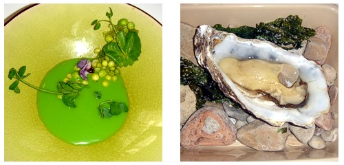 Nos hacemos verdes con los Guisantes. Provocadores, casi crudos, sobre lecho de su sopa y poniendo límite a su dulzura a base de huevas de pez volador y wasabi -sí, esta vez wasabi-.