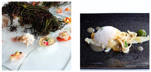 La segunda parte de la degustación nos adentra en El Mar, con su particular Entorno de cañaílla -¡qué aroma!-, el curioso toque nipón del bogavante roll, la brutal almeja y pimientas, un tiradito la mar de esponjoso -no creo que Albert Adrià llegara a imaginar las numerosísimas aplicaciones de su técnica de bizcocho al micro en alta cocina-, la lluenta, la quisquilla, un magnífico hígado de rape -que me recuerda que llevo mucho sin pasar por Dos Palillos-, y el llamado pescaíto, en formato de pequeña torta de camarones.